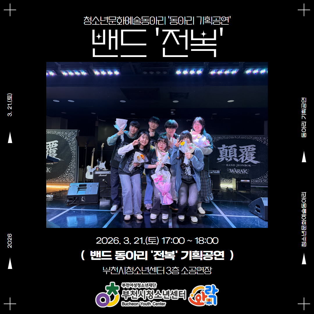 2026 청소년문화예술동아리 모집 중! 연습부터 공연까지, 무대를 꿈꾸는 청소년이라면 지금이 기회! 부천시청소년센터에서는 밴드·댄스·보컬·연극 등 다양한 청소년문화예술동아리를 모집합니다 전문 연습공간 지원 ✔ 녹음실 ✔ 소공연장 ✔ 춤춰락(최대 10명) ✔ 오락실(최대 20명) 활동 혜택도 풍부하게! ✔ 전문교육 지원 ✔ 공연·교류행사 참여 ✔ 단체복 & 뮤직비디오 촬영 기회까지(우수 동아리) 모집 대상 ▶ 13~24세 청소년 ▶ 3인 이상으로 구성된 문화예술동아리 활동 기간 최종 확정 후 ~ 2026.12.31 (재등록 가능) 신청 방법 QR코드 접속 → 신청서 작성 → 담당자 면담 후 확정 무대 위의 주인공은 바로 너! 지금 도전해보세요 ✨ 문의 | 032 325 4300 부천시청소년센터 #부천시청소년센터 #청소년문화예술동아리 #2026동아리모집 #청소년밴드 #청소년댄스 #청소년공연 #연습실지원 #와락 #문화예술청소년
