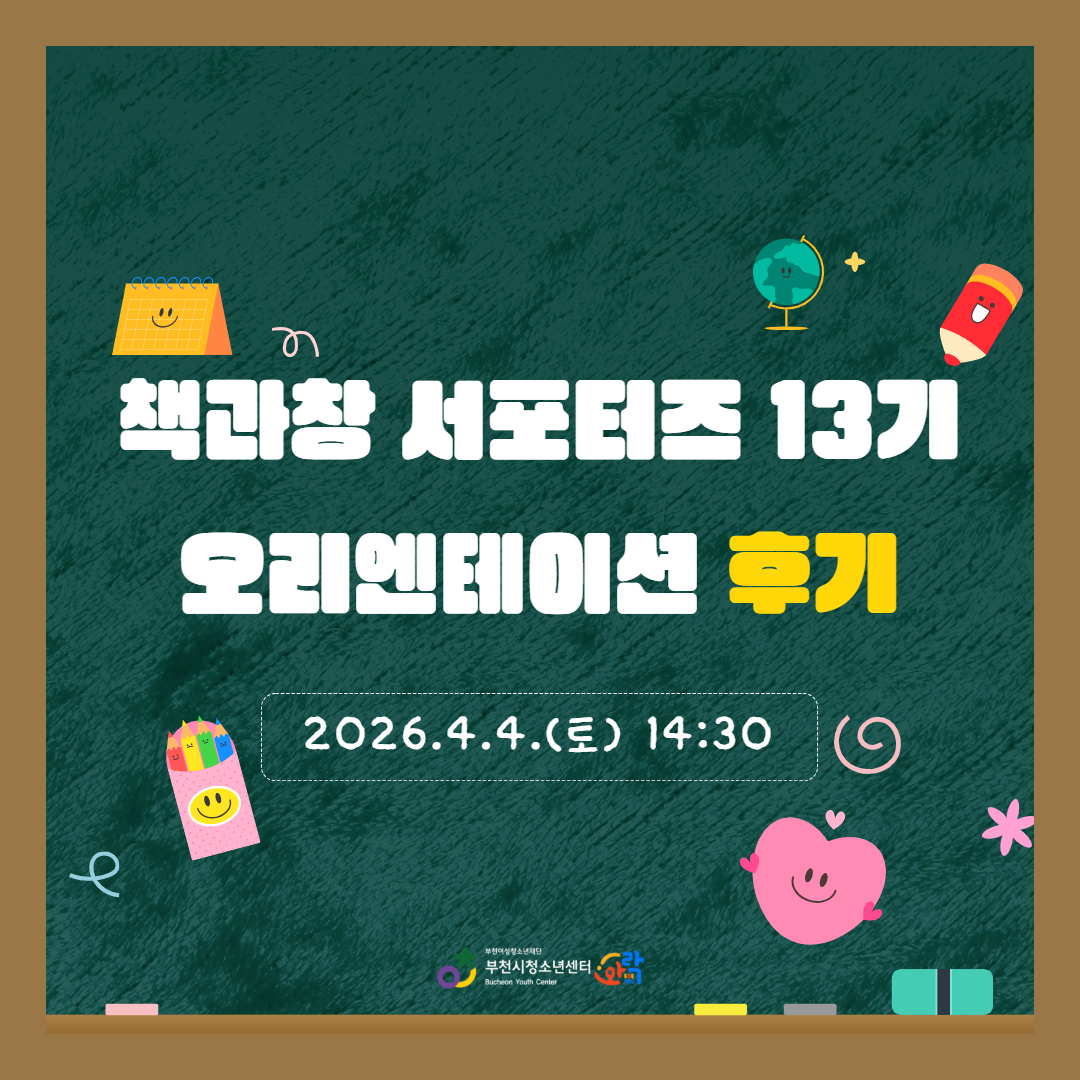 2026. 청소년 전용공간 '책과창' 서포터즈 모집 청소년 전용공간 ‘책과창’에서 아이디어를 직접 내고, 함께 기획하며 활동할 서포터즈를 모집합니다. 모집기간: ~ 2026.2. 28.(토) 모집대상: 14~24세 청소년 신청방법: QR코드 신청 및 홈페이지 참고 문의사항: 032 325 4300