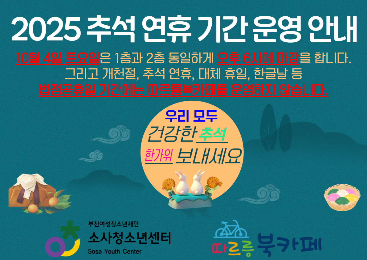 공지사항 홈 > 알림마당 > 공지사항 소사청소년센터 따르릉북카페 이용 안내 상세보기 - 제목,내용,파일 정보 제공 소사청소년센터 따르릉북카페 이용 안내 내용 파일 png 문서 따르릉북카페 자율이용공간 상시 운영 시간표.png 목록 이전글 2025. 주말형방과후아카데미 가을·겨울학기 수강생 추가모집 안내 다음글 [상상아울LAB 열린 상상실 기획활동(7차) 3D펜으로 가을풍경 액자형 캔버스 제작]